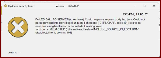 April 15, 2026, 1:44 p.m. When claiming an authorization, you get this error;Hydratec Security ErrorFAILED CALL TO SERVER (to Activate): Could not parse request body into json: Could not parse payload into json: illegal unquo…