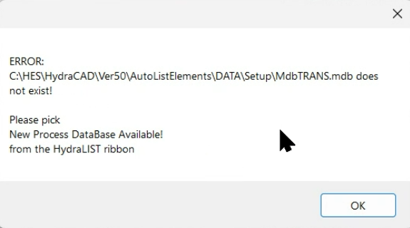 Could not find file, or Unrecognized database format 'C:\HES\HydraCAD\Ver50\AutoListElements\Data\Setup\mdbtrans.mdb'