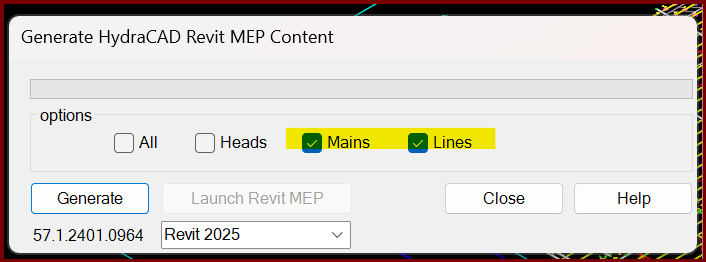 When generating the MEP content in HydraCAD for AutoCAD, do not select all. Instead select Mains and Lines individually.