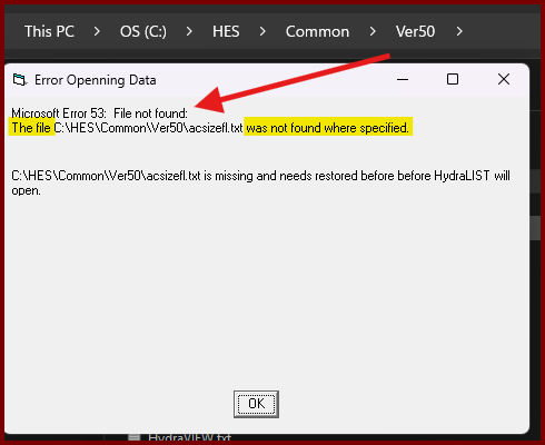 | Card 1429 View | HydraLIST (Standalone) | Open | Opening | Error 53 | When attempting to open HydraLIST after a fresh install, you get the error; [[ Error Openning (sic) Data ]] Microsoft Error 53: File not found The file ??? was not found where specified "filenamehere is missing and needs restored before before HydraLIST will open" 🤦