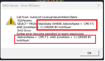 | Card 1445 View | Listing (AutoCAD Based) | Start Autolist | None | Dao Server | When running AutoLIST, partway through you get the error; DAO Server - Error RSOpen Call from AutoList::LookupValueInMainsTable SQLParams