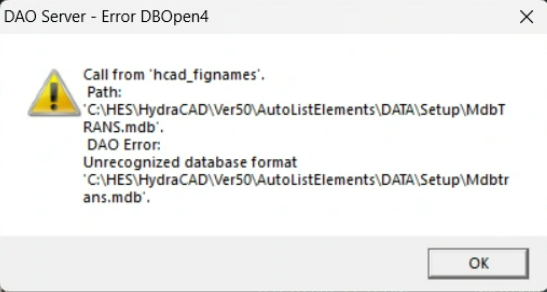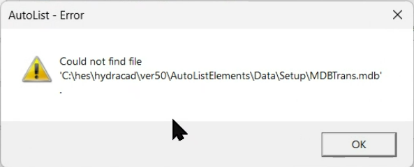 Card 1412 View | HydraLIST (Revit Based) | Create Stocklist | Continue | Autolist – Error | Could not find file, or Unrecognized database format 'C:\HES\HydraCAD\Ver50\AutoListElements\Data\Setup\mdbtrans.mdb' | |