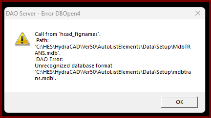 Card 1409 View | Opening a Drawing (AutoCAD Based) | None | None | Dao Server | When trying to open a drawing file, you get this error; DAO Server - Error DBOpen4 Call from 'hcad_fignames'. Path:'C:\HES\HydraCAD\Ver50\AutoListElements\Data\Setup\MdbTRANS.mdb' DAO Error: Unrecognized database format C:\HES\HydraCAD\Ver50\AutoListElements\Data\Setup\mdbtrans.mdb' When you click OK, AutoCAD crashes out |