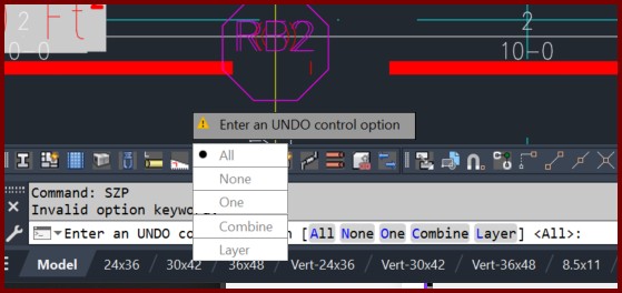 Card 1410 View | Piping (AutoCAD Based) | Size Pipe Setup | None | None | When attempting to insert a pipe dimension you get the error "Invalid option keyword" And the command prompt says "Enter an UNDO control option" with the dialog showing your choices |